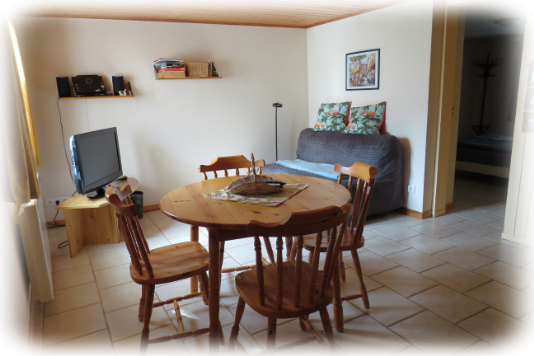 TV, clic-clac, table ronde, armoire et petit buffet de rangement.